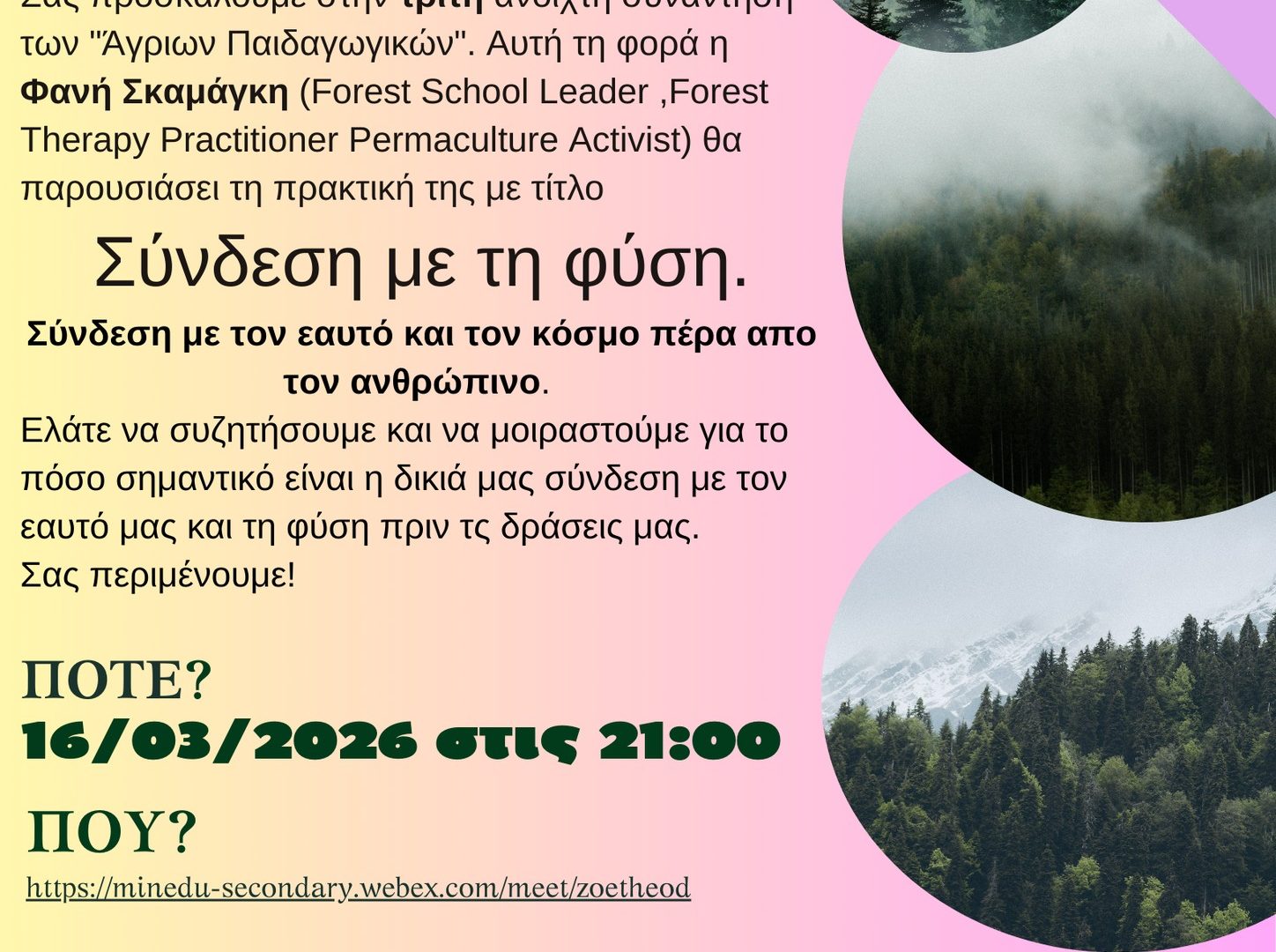 Τη Δευτέρα 16 Μαρτίου 2026 στις 21:00, η Φανή Σκαμάγκη (Forest School Leader, Forest Therapy Practitioner, Permaculture Activist) θα παρουσιάσει την πρακτική της με τίτλο: “Σύνδεση με τη φύση”